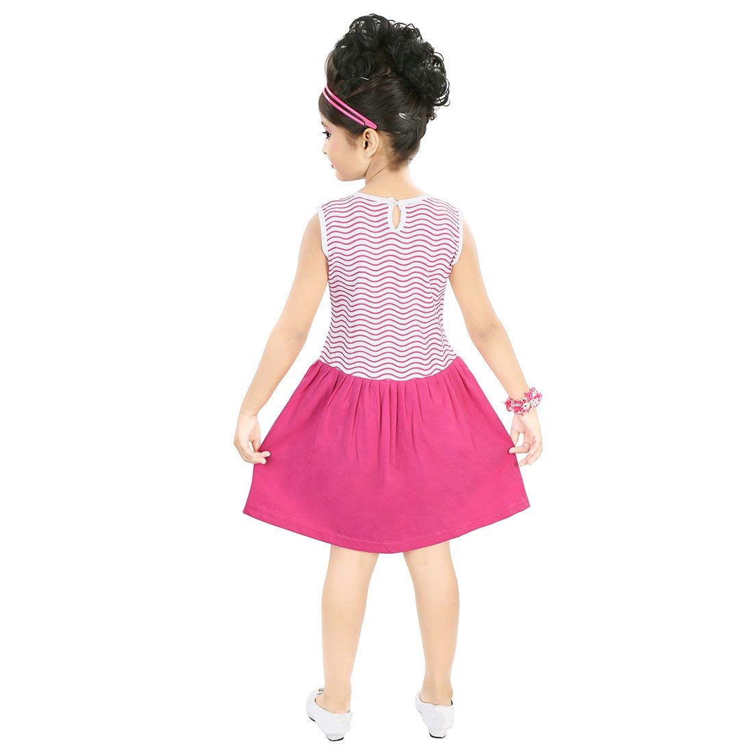 The unique floral accent on this printed cotton frock is simply adorable and is a perfect choice for a barbie doll like appearance